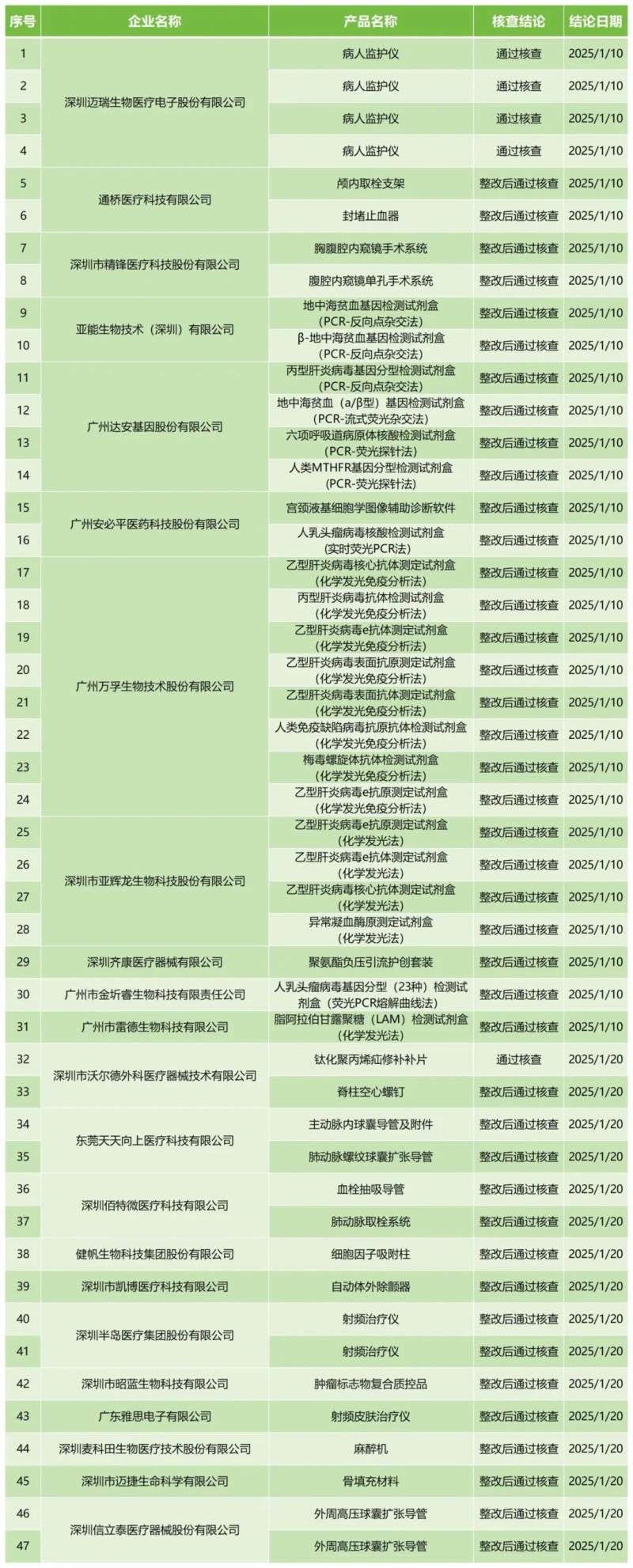 2月12日,廣東省藥監(jiān)局官網(wǎng)公布2025年1月醫(yī)療器械注冊(cè)質(zhì)量管理體系核查結(jié)果,包括深圳邁瑞生物醫(yī)療電子股份有限公司的四款病人監(jiān)護(hù)儀、深圳半島醫(yī)療集團(tuán)股份有限公司的兩款射頻治療儀、廣東雅思電子有限公司的射頻皮膚治療儀等共計(jì)47款產(chǎn)品,其中有五款產(chǎn)品核查結(jié)論為“通過(guò)核查”,其余均為“整改后通過(guò)核查”。具體明細(xì)見下方表格: