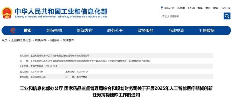 日前,工業(yè)和信息化部辦公廳、國家藥品監(jiān)督管理局綜合和規(guī)劃財務(wù)司聯(lián)合印發(fā)《關(guān)于開展2025年人工智能醫(yī)療器械創(chuàng)新任務(wù)揭榜掛帥工作的通知》(工信廳聯(lián)科函〔2025〕30號)(以下簡稱《通知》),以推動人工智能技術(shù)與醫(yī)療器械深度融合發(fā)展,更好地服務(wù)和保障人民群眾生命健康,加快形成新質(zhì)生產(chǎn)力。