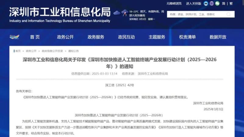 3月3日,深圳市工業(yè)和信息化局發(fā)布《深圳市加快打造人工智能先鋒城市行動(dòng)計(jì)劃(2025—2026年)》(以下簡(jiǎn)稱(chēng)《行動(dòng)計(jì)劃》),以搶抓人工智能發(fā)展新機(jī)遇,支持人工智能技術(shù)賦能智能終端產(chǎn)品,推動(dòng)智能終端產(chǎn)業(yè)高質(zhì)量跨越式發(fā)展,加快建設(shè)國(guó)際國(guó)內(nèi)領(lǐng)先的人工智能終端產(chǎn)業(yè)集聚區(qū)。
