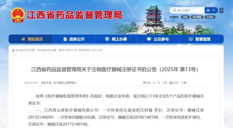 3月3日,江西省藥監(jiān)局發(fā)布通告稱,按照《醫(yī)療器械監(jiān)督管理條例》的規(guī)定,根據(jù)企業(yè)申請,該局已注銷江西青山堂醫(yī)療器械有限公司、江西奧格蘭醫(yī)療器械有限公司等3家企業(yè)共計5個產(chǎn)品的醫(yī)療器械注冊證書,具體明細(xì)如下: