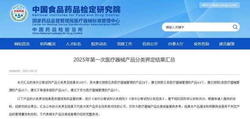 4月7日,國家藥監(jiān)局醫(yī)療器械標(biāo)準(zhǔn)管理中心發(fā)布《2025年第一次醫(yī)療器械產(chǎn)品分類界定結(jié)果匯總》,本次匯總的均為體外診斷試劑產(chǎn)品,共有168個,其中建議按照Ⅲ類醫(yī)療器械管理的產(chǎn)品24個,建議按照Ⅱ類醫(yī)療器械管理的產(chǎn)品46個,建議按照Ⅰ類醫(yī)療器械管理的產(chǎn)品65個,建議不單獨申報的產(chǎn)品24個,建議不作為醫(yī)療器械管理的產(chǎn)品9個。