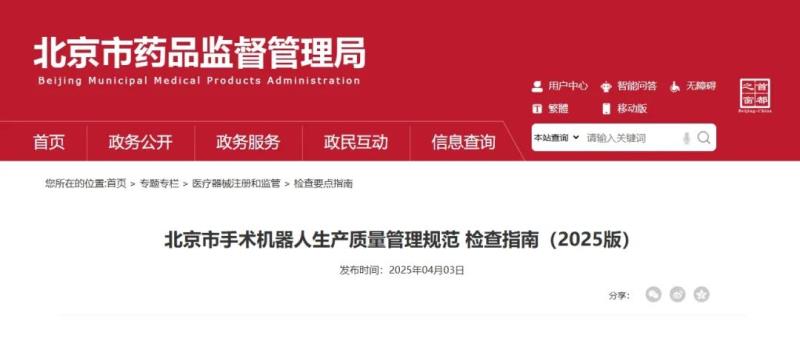近日,北京市藥監(jiān)局發(fā)布《北京市手術(shù)機(jī)器人生產(chǎn)質(zhì)量管理規(guī)范檢查指南(2025版)》(以下簡稱《指南》),旨在幫助北京市醫(yī)療器械生產(chǎn)監(jiān)管人員增強(qiáng)對手術(shù)機(jī)器人產(chǎn)品及相關(guān)生產(chǎn)質(zhì)量管理的認(rèn)知,指導(dǎo)和規(guī)范對手術(shù)機(jī)器人注冊人、受托生產(chǎn)企業(yè)(以下統(tǒng)稱“生產(chǎn)企業(yè)”)的監(jiān)督檢查工作,同時(shí)為相關(guān)生產(chǎn)企業(yè)開展生產(chǎn)管理活動提供參考。