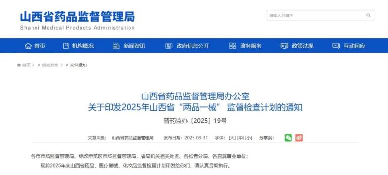 《2025年山西省醫(yī)療器械生產企業(yè)監(jiān)督檢查計劃》全文如下: