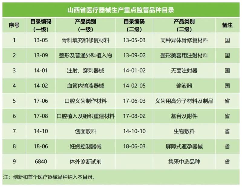 近日,山西省藥監(jiān)局發(fā)布《關于印發(fā)2025年山西省“兩品一械” 監(jiān)督檢查計劃的通知》,共包含《2025年度山西省藥品生產領域監(jiān)督檢查計劃》《2025年度山西省醫(yī)療器械臨床試驗機構監(jiān)督檢查計劃》《2025年山西省醫(yī)療器械生產企業(yè)監(jiān)督檢查計劃》《2025年山西省醫(yī)療器械經營使用環(huán)節(jié)監(jiān)管工作要點》《2025年度山西省化妝品監(jiān)督檢查計劃》5個附件,其中《2025年山西省醫(yī)療器械生產企業(yè)監(jiān)督檢查計劃》明確了檢查的重點企業(yè)、重點產品和重點內容,并以附件形式列出了醫(yī)療器械生產9大重點監(jiān)管品種,還列出了山西省醫(yī)療器械生產企業(yè)分級監(jiān)管清單(四級監(jiān)管30家、三級監(jiān)管100家、二級監(jiān)管146家),其中9大重點監(jiān)管品種具體如下: