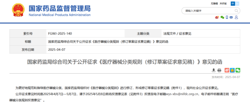 4月7日,國家藥監(jiān)局發(fā)布《醫(yī)療器械分類規(guī)則(修訂草案征求意見稿)》,并向社會公開征求意見。
