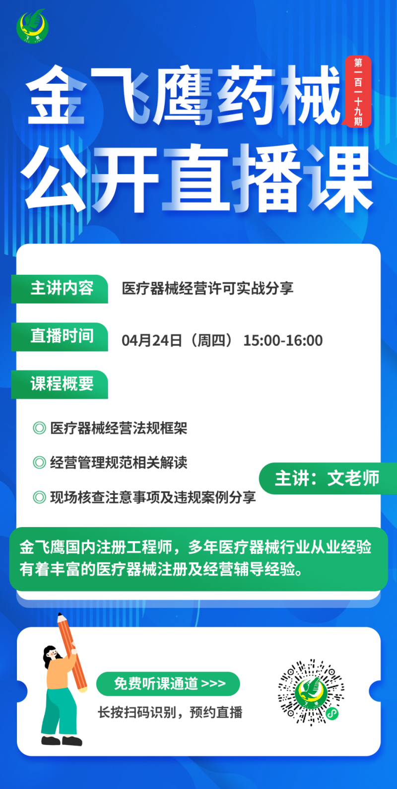 4月24日下午3點(diǎn),金飛鷹國內(nèi)注冊工程師、有著豐富醫(yī)療器械注冊及經(jīng)驗(yàn)輔導(dǎo)經(jīng)驗(yàn)的文老師給大家?guī)怼夺t(yī)療器械經(jīng)營許可實(shí)戰(zhàn)經(jīng)驗(yàn)分享》,培訓(xùn)內(nèi)容包括醫(yī)療器械經(jīng)營法規(guī)框架、經(jīng)營管理規(guī)范相關(guān)解讀、現(xiàn)場核查注意事項(xiàng)及違規(guī)案例分享,結(jié)合他本身積累的豐富經(jīng)營許可辦理經(jīng)驗(yàn),從理論解讀到實(shí)操指導(dǎo),全方位剖析醫(yī)療器械經(jīng)營許可的申報(bào)要點(diǎn)與技巧。