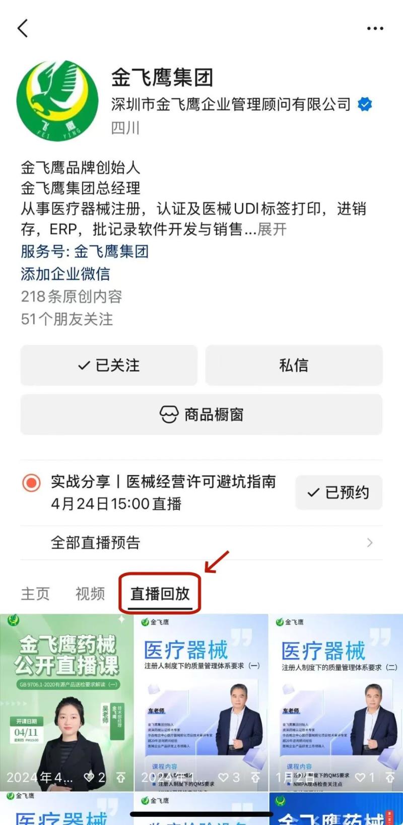 金飛鷹直播培訓(xùn)簡介 金飛鷹直播培訓(xùn),是每周一次的固定培訓(xùn)欄目,優(yōu)選金飛鷹國內(nèi)外資深注冊/項(xiàng)目老師定期為大家講解醫(yī)療器械注冊相關(guān)知識,解答大家在醫(yī)療器械注冊過程中的諸多疑問。 此前我們已為大家?guī)硇掳驷t(yī)療器械生物學(xué)評價(jià)標(biāo)準(zhǔn)、新版醫(yī)療器械風(fēng)險(xiǎn)管理標(biāo)準(zhǔn)、醫(yī)療器械軟件注冊、醫(yī)療器械質(zhì)量管理體系提升技巧等共計(jì)118次線上培訓(xùn)課程,有興趣的可點(diǎn)擊視頻號直播回放進(jìn)行查看~另外大家也一定很關(guān)注接下來的培訓(xùn)主題,相關(guān)培訓(xùn)預(yù)告我們會陸續(xù)添加至視頻號,請大家持續(xù)關(guān)注哦! 往期直播培訓(xùn)課程支持回放,關(guān)注“金飛鷹藥械咨詢服務(wù)”視頻號并點(diǎn)擊視頻號主頁,即可查看“直播回放”哦~