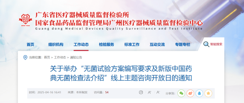 近日,廣東省醫(yī)療器械質(zhì)量監(jiān)督檢驗(yàn)所官網(wǎng)發(fā)布通知,定于4月27日(周日)舉辦“無(wú)菌試驗(yàn)方案編寫(xiě)要求及新版中國(guó)藥典無(wú)菌檢查法介紹”線上主題咨詢開(kāi)放日活動(dòng),具體時(shí)間及參會(huì)方式如下: