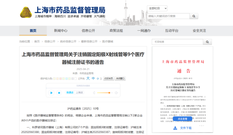 4月21日,上海市藥監(jiān)局發(fā)布通告稱,按照《醫(yī)療器械監(jiān)督管理?xiàng)l例》的規(guī)定,根據(jù)企業(yè)申請,該局已注銷科羅諾司醫(yī)療器械(上海)有限公司等2家企業(yè)共9個產(chǎn)品的醫(yī)療器械注冊證,包括固定陽極X射線管、數(shù)字中功率耳背式助聽器等,具體明細(xì)如下: