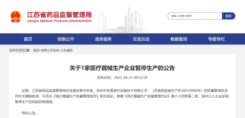 近日,江蘇省藥監(jiān)局發(fā)布公告稱,該局在監(jiān)督檢查中發(fā)現(xiàn),徐州市**醫(yī)療設(shè)備技術(shù)有限公司(蘇食藥監(jiān)械生產(chǎn)許20010060號)的質(zhì)量管理體系存在關(guān)鍵缺陷項,不符合《醫(yī)療器械生產(chǎn)質(zhì)量管理規(guī)范》相關(guān)規(guī)定。根據(jù)《醫(yī)療器械生產(chǎn)監(jiān)督管理辦法》第六十四條第二款,現(xiàn)對以上企業(yè)采取暫停生產(chǎn)的風(fēng)險控制措施。