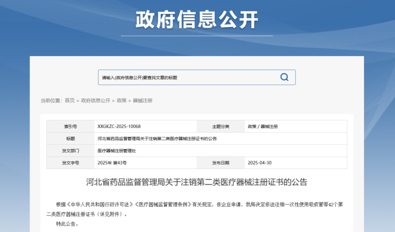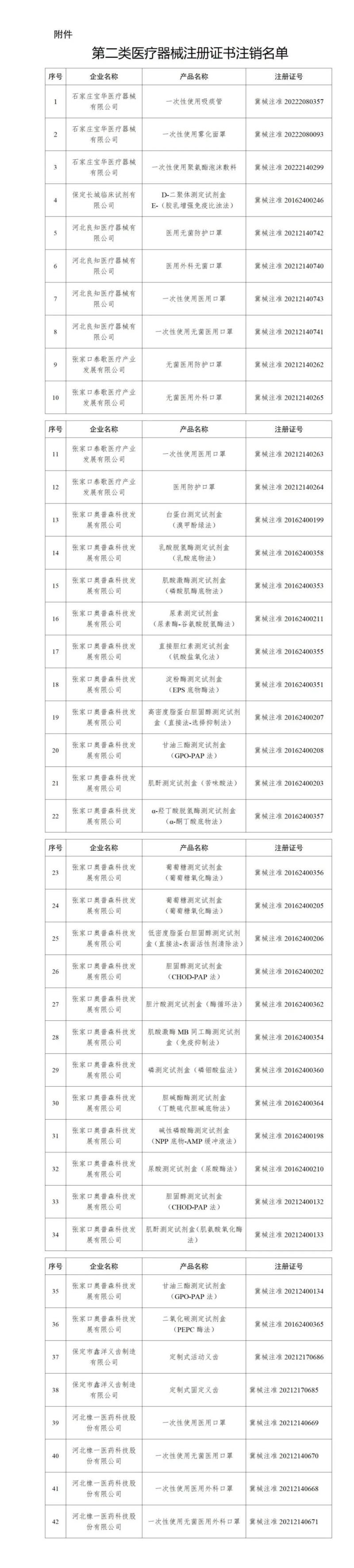 近日,河北省藥監(jiān)局發(fā)布公告稱,根據(jù)《中華人民共和國(guó)行政許可法》《醫(yī)療器械監(jiān)督管理?xiàng)l例》有關(guān)規(guī)定,依企業(yè)申請(qǐng),該局依法注銷了42個(gè)第二類醫(yī)療器械注冊(cè)證書(shū),其中有12款產(chǎn)品為醫(yī)用口罩,還有一次性使用吸痰管、一次性使用霧化面罩、一次性使用聚氨酯泡沫敷料、定制式活動(dòng)義齒等,具體明細(xì)如下: