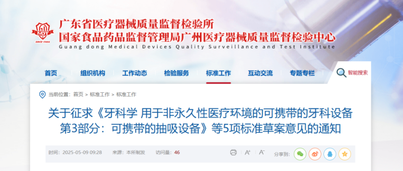 近日,廣東省醫(yī)療器械質(zhì)量監(jiān)督檢驗(yàn)所發(fā)布通知稱(chēng),根據(jù)《國(guó)家藥監(jiān)局綜合司關(guān)于印發(fā)2025年醫(yī)療器械行業(yè)標(biāo)準(zhǔn)制修訂計(jì)劃項(xiàng)目的通知》的要求,以及全國(guó)口腔材料和器械設(shè)備標(biāo)準(zhǔn)化技術(shù)委員會(huì)齒科設(shè)備與器械分技術(shù)委員會(huì)2025年的標(biāo)準(zhǔn)制修訂工作安排,齒科分技委組織相關(guān)起草單位完成了《牙科學(xué) 用于非永久性醫(yī)療環(huán)境的可攜帶的牙科設(shè)備 第3部分:可攜帶的抽吸設(shè)備》《牙科學(xué) 根管器械 第2部分:擴(kuò)大鉆》等5項(xiàng)標(biāo)準(zhǔn)草案征求意見(jiàn)稿,具體如下: