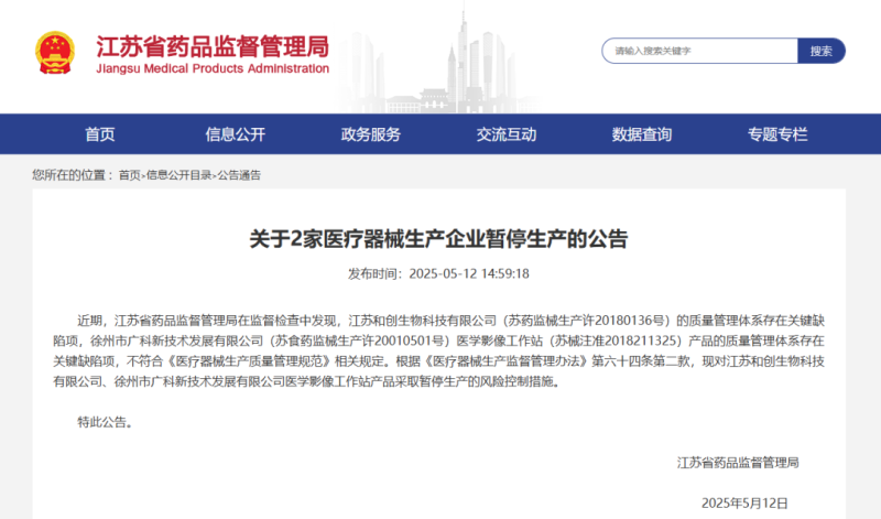 近日,江蘇省藥監(jiān)局發(fā)布公告稱,該局在監(jiān)督檢查中發(fā)現(xiàn),江蘇**生物科技有限公司(蘇藥監(jiān)械生產(chǎn)許201801**號)的質(zhì)量管理體系存在關(guān)鍵缺陷項,徐州市**新技術(shù)發(fā)展有限公司(蘇食藥監(jiān)械生產(chǎn)許200105**號)醫(yī)學(xué)影像工作站(蘇械注準(zhǔn)20182113**)產(chǎn)品的質(zhì)量管理體系存在關(guān)鍵缺陷項,不符合《醫(yī)療器械生產(chǎn)質(zhì)量管理規(guī)范》相關(guān)規(guī)定。根據(jù)《醫(yī)療器械生產(chǎn)監(jiān)督管理辦法》第六十四條第二款,現(xiàn)對江蘇**生物科技有限公司、徐州市**新技術(shù)發(fā)展有限公司醫(yī)學(xué)影像工作站產(chǎn)品采取暫停生產(chǎn)的風(fēng)險控制措施。