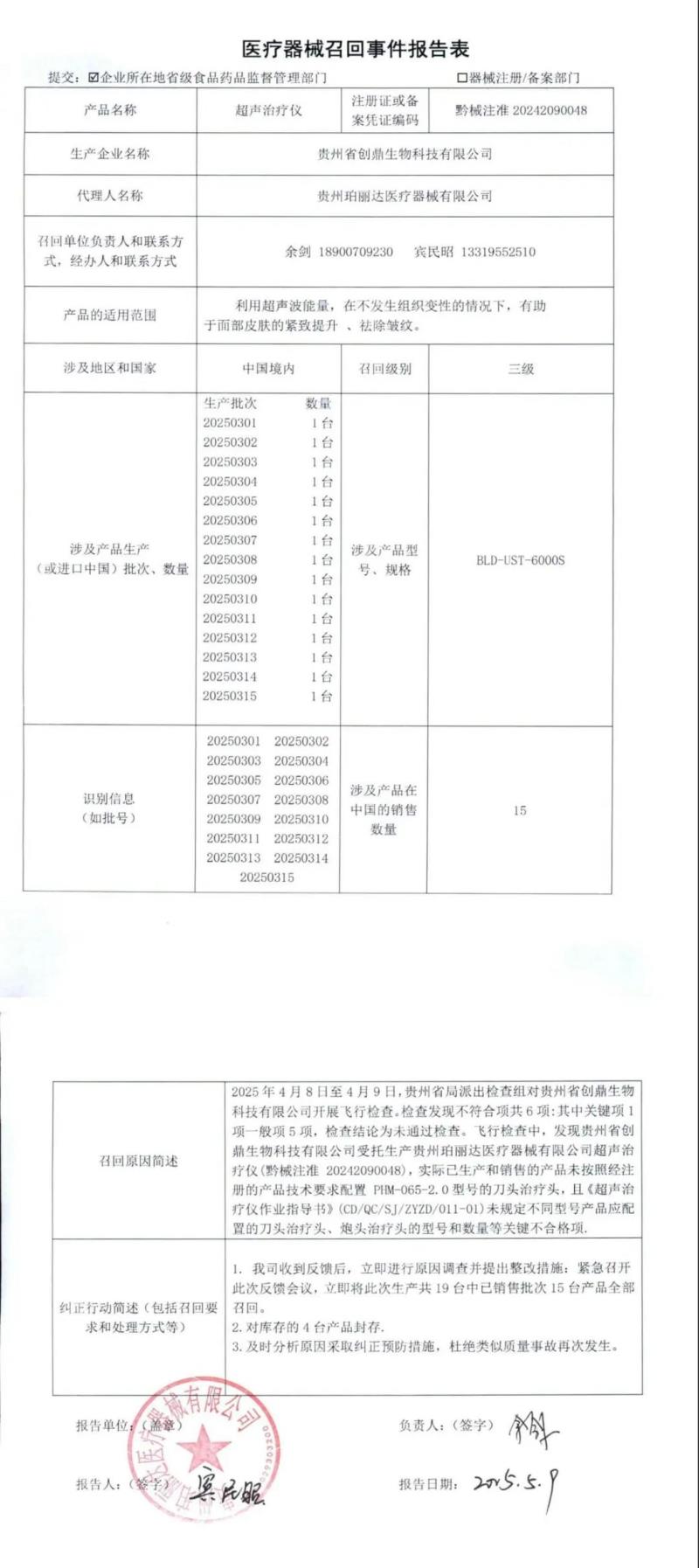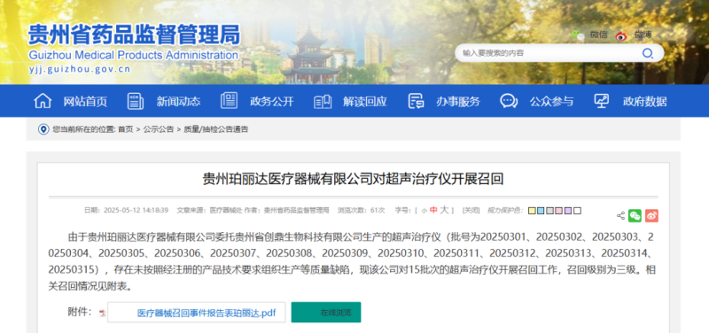 5月12日,貴州省藥監(jiān)局發(fā)布一則召回公告,其中提到,由于貴州珀麗達(dá)醫(yī)療器械有限公司委托貴州省創(chuàng)鼎生物科技有限公司生產(chǎn)的超聲治療儀(產(chǎn)品適用范圍:利用超聲波能量,在不發(fā)生組織變性的情況下,有助于面部皮膚的緊致提升、祛除皺紋),存在未按照經(jīng)注冊(cè)的產(chǎn)品技術(shù)要求組織生產(chǎn)等質(zhì)量缺陷,現(xiàn)該公司對(duì)15批次的超聲治療儀開展召回工作,召回級(jí)別為三級(jí)。具體召回情況如下: