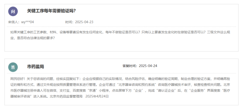 根據北京市藥監(jiān)局的答復,企業(yè)應根據自己的實際情況,結合風險評估,確定明確的驗證周期,制定合理的驗證方案,并明確再驗證的情形和方式,通過文件規(guī)定按照質量管理體系進行管理。