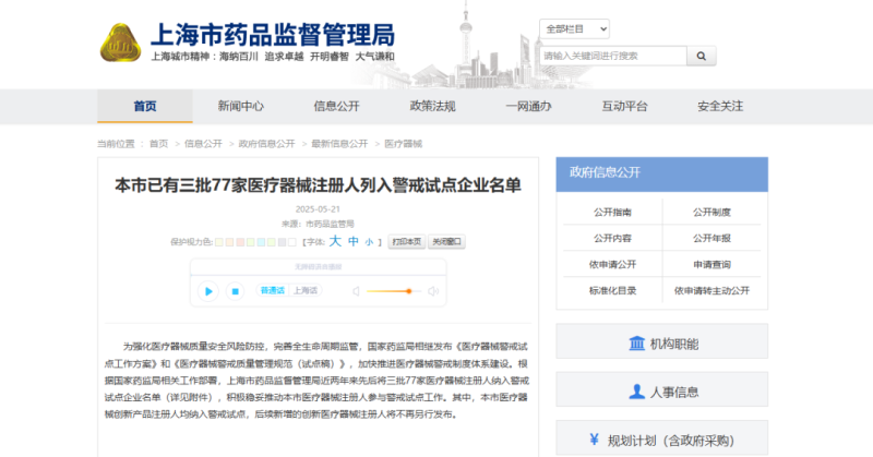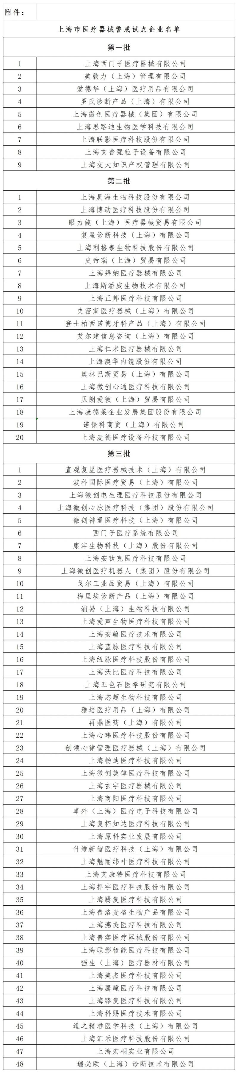 5月21日,上海市藥監(jiān)局發(fā)布該市醫(yī)療器械注冊人警戒試點(diǎn)企業(yè)名單,其中提到,該局近兩年來先后將三批77家醫(yī)療器械注冊人納入警戒試點(diǎn)企業(yè)名單(具體見下圖),積極穩(wěn)妥推動(dòng)上海市醫(yī)療器械注冊人參與警戒試點(diǎn)工作。其中,上海市醫(yī)療器械創(chuàng)新產(chǎn)品注冊人均納入警戒試點(diǎn),后續(xù)新增的創(chuàng)新醫(yī)療器械注冊人將不再另行發(fā)布。