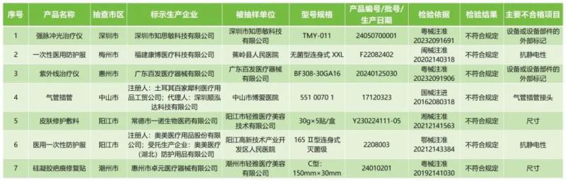 近日,廣東省藥監(jiān)局發(fā)布《關(guān)于醫(yī)療器械抽查檢驗信息的通告(2025年第1期,總第91期)》,我們通過查看附件發(fā)現(xiàn),本次共抽檢了541批次產(chǎn)品,其中有7批次產(chǎn)品不符合規(guī)定,包括強脈沖光治療儀、一次性醫(yī)用防護服、紫外線治療儀等,不符合規(guī)定產(chǎn)品具體明細(xì)如下: