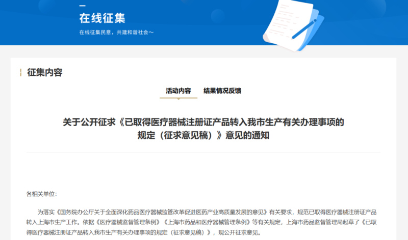 近日,上海市藥監(jiān)局發(fā)布《已取得醫(yī)療器械注冊證產(chǎn)品轉(zhuǎn)入我市生產(chǎn)有關(guān)辦理事項的規(guī)定》(以下簡稱《規(guī)定》),并向社會公開征求意見。