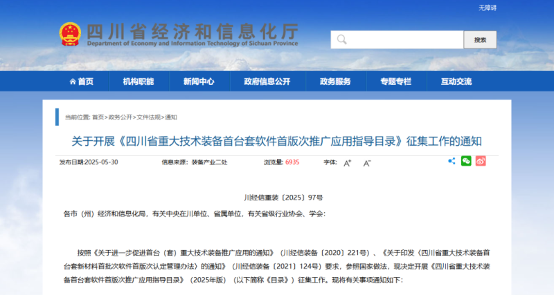 近日,四川省經(jīng)濟和信息化廳發(fā)布《關(guān)于開展〈四川省重大技術(shù)裝備首臺套軟件首版次推廣應(yīng)用指導(dǎo)目錄〉征集工作的通知》(以下簡稱《通知》),其中提到,申請列入《四川省重大技術(shù)裝備首臺套軟件首版次推廣應(yīng)用指導(dǎo)目錄(2025版)》的重大技術(shù)裝備產(chǎn)品應(yīng)能夠支撐打造現(xiàn)代產(chǎn)業(yè)體系、建設(shè)國家戰(zhàn)略腹地,重點聚焦人工智能、低空經(jīng)濟、航空航天、新能源、高端能源裝備、新能源汽車及動力電池等重點產(chǎn)業(yè)鏈領(lǐng)域,工業(yè)母機、軌道交通裝備等領(lǐng)先領(lǐng)域,行業(yè)專用裝備等優(yōu)勢領(lǐng)域,先進核技術(shù)應(yīng)用裝備、未來交通裝備、深空深地裝備等新興和未來領(lǐng)域,以及重大工程施工裝備、農(nóng)機裝備、應(yīng)急裝備、醫(yī)療裝備、民生裝備等領(lǐng)域。