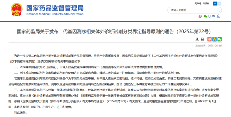 6月10日,國家藥監(jiān)局發(fā)布《二代基因測序相關(guān)體外診斷試劑分類界定指導(dǎo)原則》(以下簡稱《指導(dǎo)原則》),并就《指導(dǎo)原則》實施的有關(guān)事項通告如下: