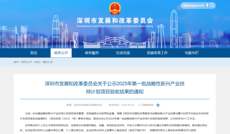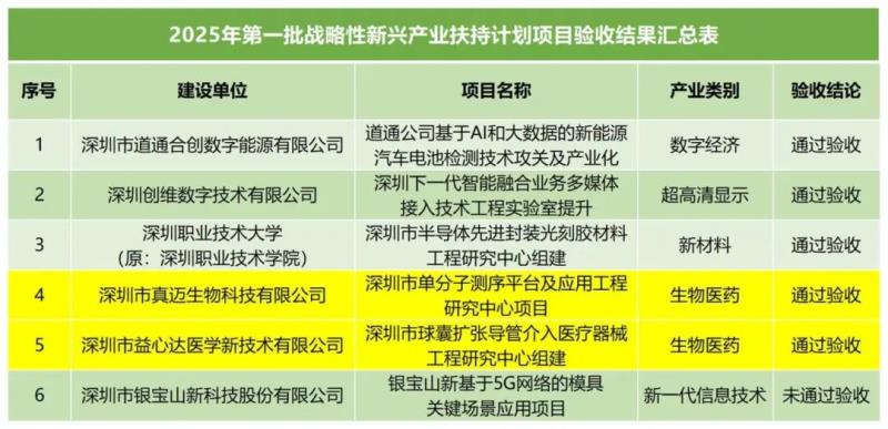 近日,深圳市發(fā)展和改革委員會(huì)公示了《2025年第一批戰(zhàn)略性新興產(chǎn)業(yè)扶持計(jì)劃項(xiàng)目驗(yàn)收結(jié)果》,本期共有6個(gè)項(xiàng)目(5個(gè)通過驗(yàn)收1個(gè)未通過驗(yàn)收),5個(gè)通過驗(yàn)收的項(xiàng)目中有2個(gè)“生物醫(yī)藥”領(lǐng)域的,具體明細(xì)如下