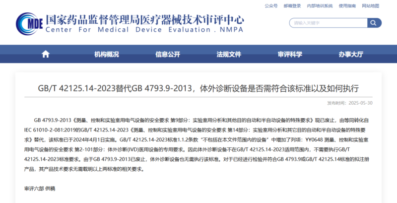 如題,根據(jù)國家藥監(jiān)局器審中心的答復(fù),GB 4793.9-2013《測量、控制和實驗室用電氣設(shè)備的安全要求 第9部分:實驗室用分析和其他目的自動和半自動設(shè)備的特殊要求》現(xiàn)已廢止,由等同轉(zhuǎn)化自IEC 61010-2-081:2019的GB/T 42125.14-2023《測量、控制和實驗室用電氣設(shè)備的安全要求 第14部分:實驗室用分析和其它目的自動和半自動設(shè)備的特殊要求》替代,該標(biāo)準(zhǔn)已于2024年4月1日起實施。
