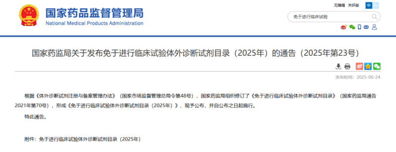 6月24日,國家藥監(jiān)局發(fā)布《免于進行臨床試驗體外診斷試劑目錄(2025年)》(以下簡稱“2025年目錄”),共有445類IVD產(chǎn)品可免于臨床試驗,其中Ⅲ類產(chǎn)品27種,Ⅱ類產(chǎn)品418種。我們通過與《免于臨床試驗體外診斷試劑目錄(2021年)》進行簡單對比,2025年目錄中新增的免于臨床試驗產(chǎn)品大概有這些(可能會有疏漏,歡迎指正):