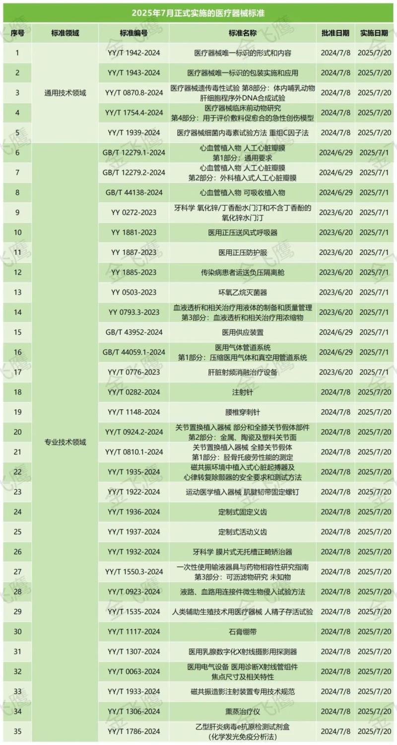 根據(jù)金飛鷹匯總整理,2025年7月起正式實(shí)施的醫(yī)療器械標(biāo)準(zhǔn)共35項(xiàng),其中已于7月1日實(shí)施的有GB/T 12279.1-2024《心血管植入物 人工心臟瓣膜 第1部分:通用要求》、YY 1887-2023《醫(yī)用正壓防護(hù)服》、YY 0503-2023《環(huán)氧乙烷滅菌器》等共12項(xiàng),即將于7月20日實(shí)施的有YY/T 1942-2024《醫(yī)療器械唯一標(biāo)識(shí)的形式和內(nèi)容》、YY/T 0282-2024《注射針》、YY/T 1936-2024《定制式固定義齒》等共23項(xiàng),具體明細(xì)如下: