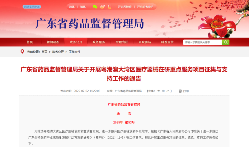 7月2日,廣東省藥監(jiān)局發(fā)布《關(guān)于開展粵港澳大灣區(qū)醫(yī)療器械在研重點服務(wù)項目征集與支持工作的通告》(以下簡稱《通告》),以推動粵港澳大灣區(qū)醫(yī)療器械創(chuàng)新和高質(zhì)量發(fā)展,進(jìn)一步提升醫(yī)療器械創(chuàng)新研發(fā)效率。《通告》正文內(nèi)容如下: