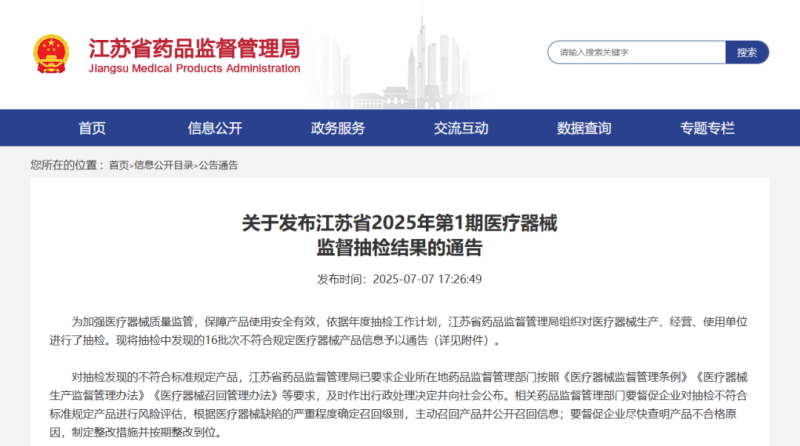 江蘇藥監(jiān)局抽檢:制氧機(jī)等16批次產(chǎn)品不符合規(guī)定