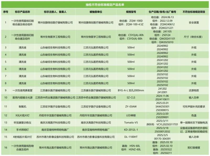 近日,江蘇省藥監(jiān)局發(fā)布《江蘇省2025年第1期醫(yī)療器械監(jiān)督抽檢結(jié)果的通告》,共通告了一次性使用直線切割吻合器及吻合組件、一次性使用鼻氧管、制氧機(jī)、聽覺康復(fù)訓(xùn)練儀16批次不符合規(guī)定醫(yī)療器械產(chǎn)品,具體明細(xì)如下: