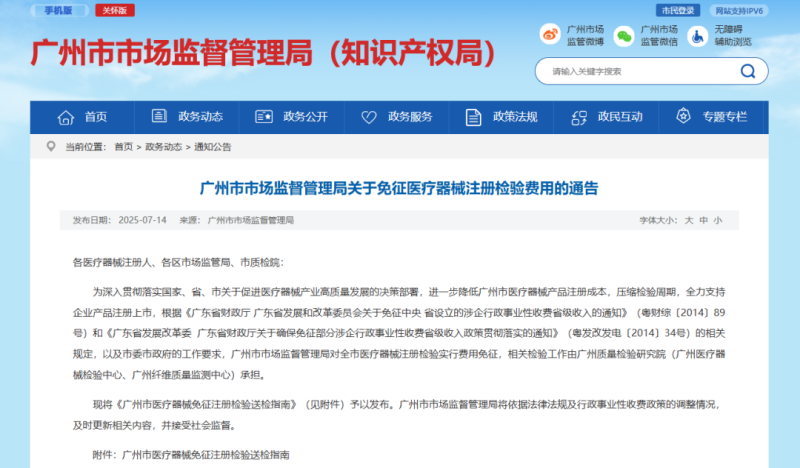 7月14日,廣州市市場監(jiān)督管理局發(fā)布《廣州市醫(yī)療器械免征注冊檢驗送檢指南》(以下簡稱《指南》),對全市醫(yī)療器械注冊檢驗實行費用免征,相關(guān)檢驗工作由廣州質(zhì)量檢驗研究院(廣州醫(yī)療器械檢驗中心、廣州纖維質(zhì)量監(jiān)測中心)承擔(dān)。