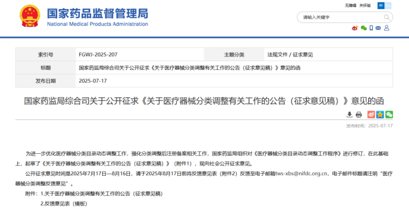 7月17日,國家藥監(jiān)局發(fā)布《關(guān)于醫(yī)療器械分類調(diào)整有關(guān)工作的公告(征求意見稿)》(以下簡稱《分類調(diào)整公告》),現(xiàn)向社會公開征求意見。