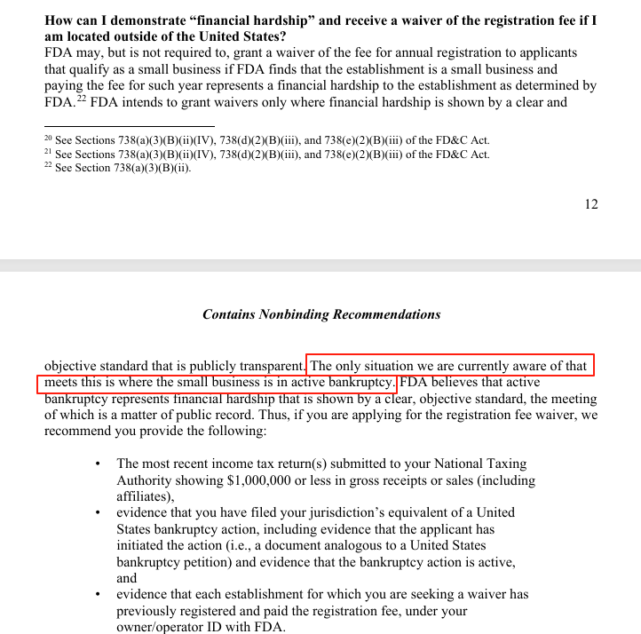 FDA 僅會在申請人通過公開透明的明確客觀標準證明其經濟困難時授予豁免。目前FDA確認符合該標準的 唯一情形 為:企業(yè)處于 active bankruptcy(在審破產程序)狀態(tài)(FDA認為在審破產程序符合“明確客觀標準”,且該狀態(tài)屬于公開法律記錄)。