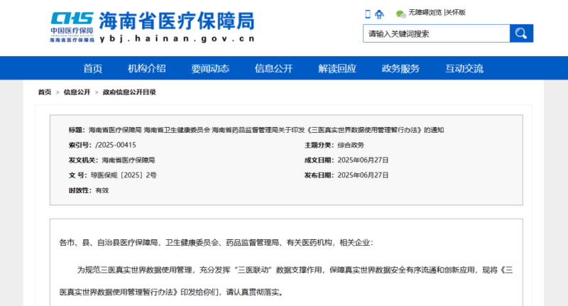近日,海南省醫(yī)療保障局、海南省衛(wèi)生健康委員會、海南省藥品監(jiān)督管理局聯(lián)合印發(fā)《三醫(yī)真實世界數(shù)據(jù)使用管理暫行辦法》(以下簡稱《辦法》),自2025年8月1日起正式施行,有效期5年。作為國內(nèi)首個明確整合醫(yī)療、醫(yī)保、醫(yī)藥(以下簡稱“三醫(yī)”)三方真實世界數(shù)據(jù)資源并規(guī)范其應(yīng)用的管理文件,《辦法》的出臺標(biāo)志著海南在利用真實世界證據(jù)支持藥械研發(fā)與評審、優(yōu)化醫(yī)保決策方面邁出關(guān)鍵一步。