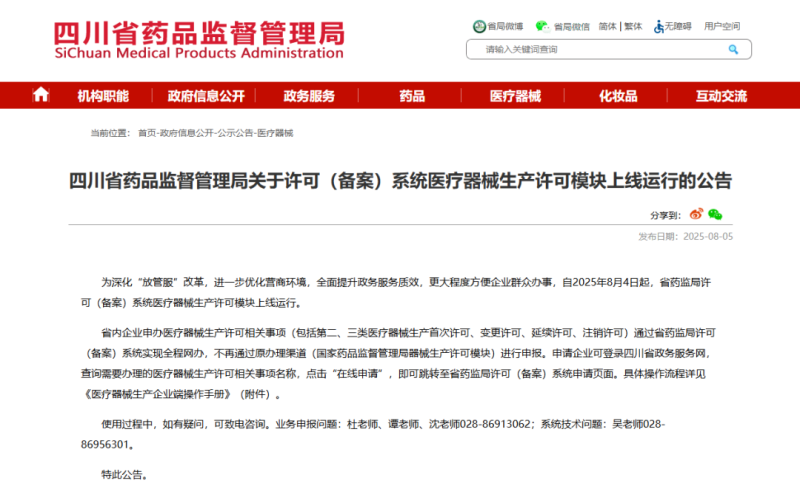 8月4日,四川省藥監(jiān)局發(fā)布《關(guān)于許可(備案)系統(tǒng)醫(yī)療器械生產(chǎn)許可模塊上線運行的公告》(以下簡稱《公告》),其中提到,2025年8月4日起,省藥監(jiān)局許可(備案)系統(tǒng)醫(yī)療器械生產(chǎn)許可模塊上線運行。