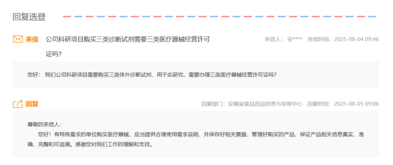 根據(jù)安徽省藥監(jiān)局的答復(fù),有特殊需求的單位購買醫(yī)療器械,應(yīng)當(dāng)提供合理使用需求說明,并保存好相關(guān)票據(jù),管理好購買的產(chǎn)品,保證產(chǎn)品相關(guān)信息真實(shí)、準(zhǔn)確、完整和可追溯。