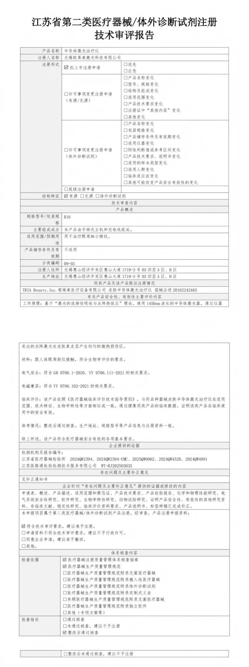8月12日,江蘇省藥監(jiān)局公布了2025年7月批準注冊的神經(jīng)肌肉電刺激儀、醫(yī)用分子篩制氧機、半導體激光治療儀、紅藍光治療儀、全自動沖擊波治療儀、醫(yī)用絲素蛋白凝膠敷料、超聲波治療儀、醫(yī)用重組膠原蛋白液體敷料、醫(yī)用壓縮式霧化器、一次性醫(yī)用激光光纖等136個醫(yī)療器械產(chǎn)品目錄,同時隨附了所有產(chǎn)品的技術(shù)審評報告,我們將其中“半導體激光治療儀”(預(yù)期用途:用于治療眼周細小皺紋)的技術(shù)審評報告以圖片形式轉(zhuǎn)載如下: