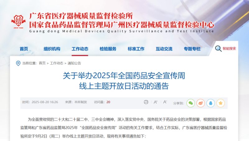 8月20日,廣東省醫(yī)療器械質(zhì)量監(jiān)督檢驗所發(fā)布通知,定于9月2日(周二)舉辦線上主題咨詢開放日活動,具體主題及參會方式如下: