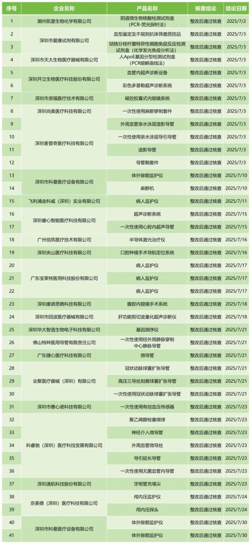 近日,廣東省藥監(jiān)局官網(wǎng)公布2025年7月醫(yī)療器械注冊質(zhì)量管理體系核查結(jié)果,包括深圳市科曼醫(yī)療設(shè)備有限公司的體外除顫監(jiān)護(hù)儀、廣州信筑醫(yī)療技術(shù)有限公司的半導(dǎo)體激光治療儀、廣東寶萊特醫(yī)用科技股份有限公司的病人監(jiān)護(hù)儀、業(yè)聚醫(yī)療器械(深圳)有限公司的冠狀動脈球囊擴(kuò)張導(dǎo)管、科睿馳(深圳)醫(yī)療科技發(fā)展有限公司的一次性使用無菌血管內(nèi)導(dǎo)管等共計(jì)41款產(chǎn)品,均為“整改后通過核查”。具體明細(xì)見下方表格: