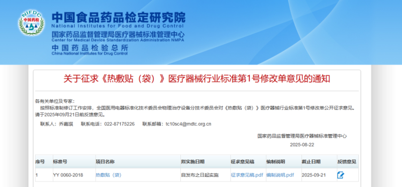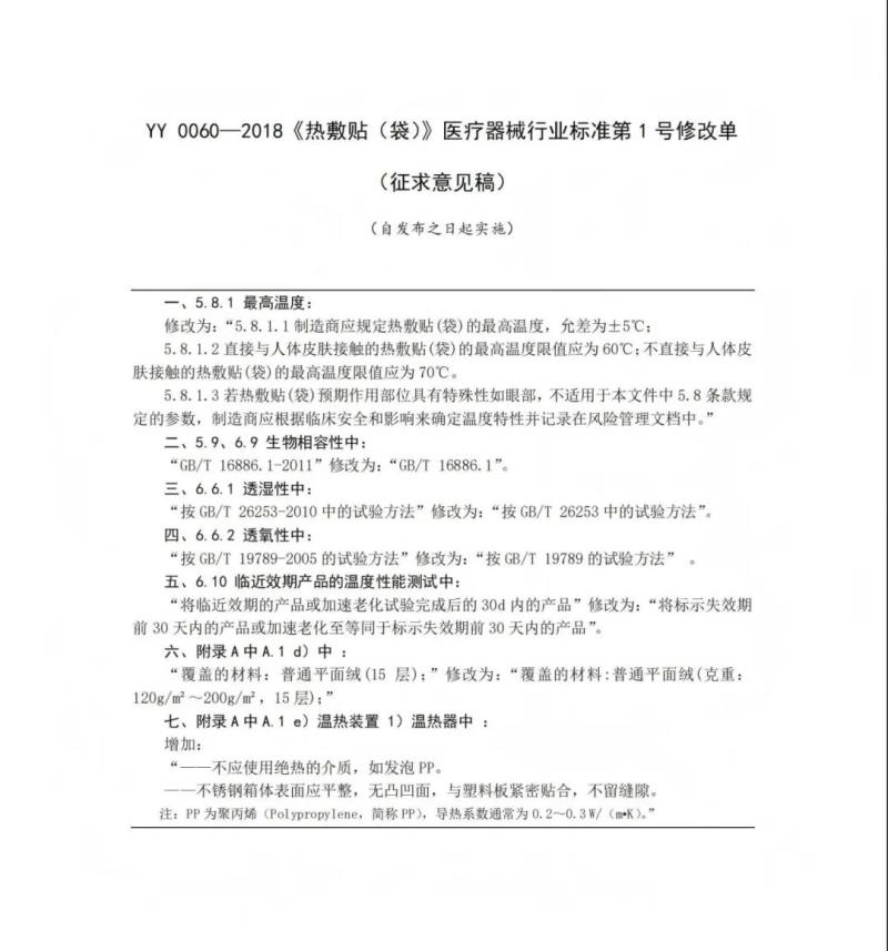 近日,國家藥監(jiān)局醫(yī)療器械標(biāo)管中心發(fā)布YY 0060-2018《熱敷貼(袋)》醫(yī)療器械行業(yè)標(biāo)準(zhǔn)第1號(hào)修改單,并向社會(huì)公開征求意見。