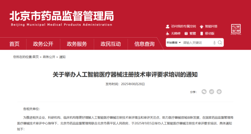 近日,北京市藥監(jiān)局發(fā)布通知,定于9月5日(周五)舉辦“人工智能醫(yī)療器械注冊技術(shù)審評要求培訓(xùn)”,具體時(shí)間及參會方式如下: