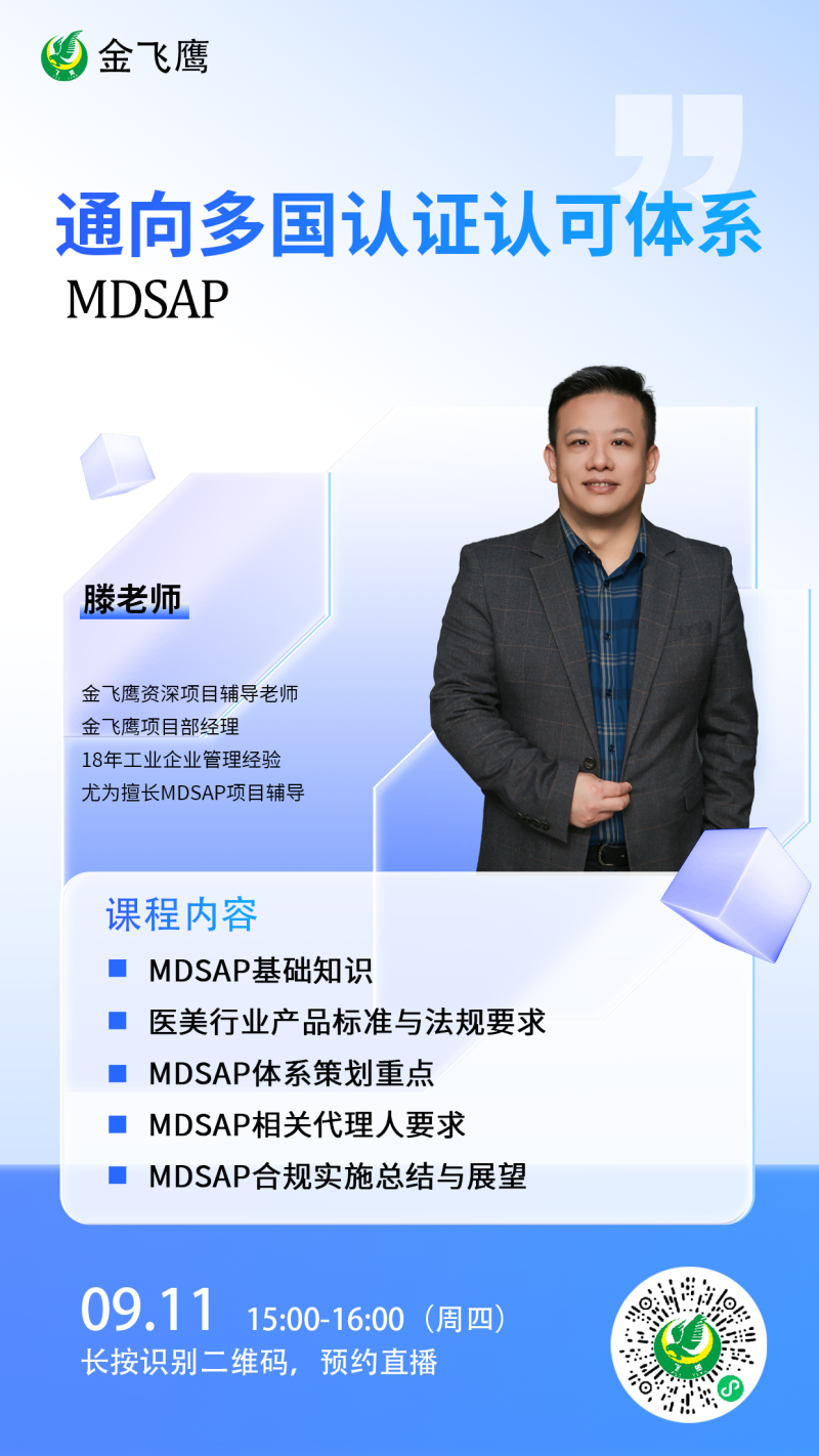 9月11日下午3點(diǎn),金飛鷹高級項(xiàng)目咨詢師、有著諸多MDSAP項(xiàng)目輔導(dǎo)經(jīng)驗(yàn)的滕老師,給大家深入淺出地講解MDSAP審核的核心邏輯與應(yīng)對技巧,讓您不僅“知其然”,更“知其所以然”!感興趣的朋友記得提前預(yù)約,鎖定這場合規(guī)必修課!